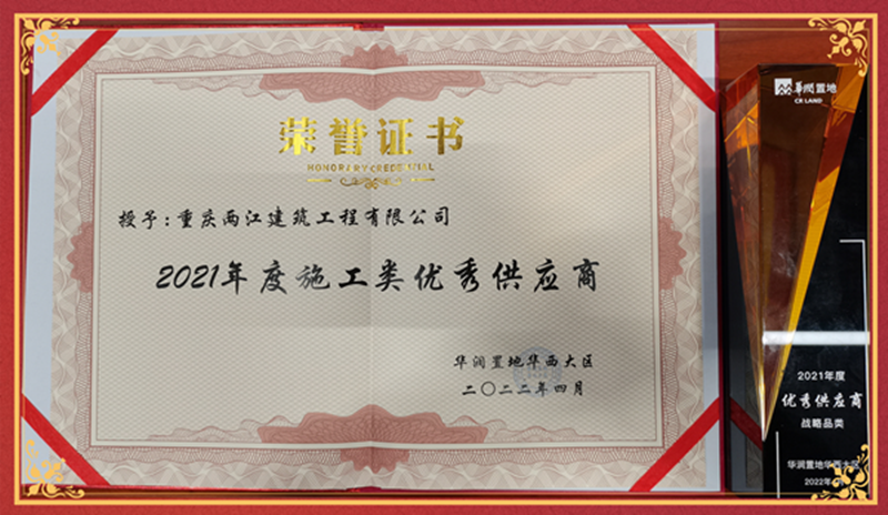 热烈祝贺我司荣获华润置地华西大区 “2021年度施工类优秀供应商奖”
